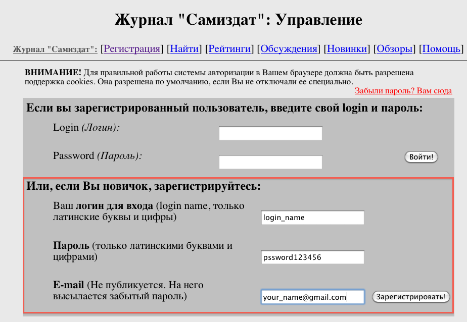 Для участия в конкурсе необходимо быть зарегистрированным автором журнала "Самиздат" (т. е. иметь свой логин и пароль).