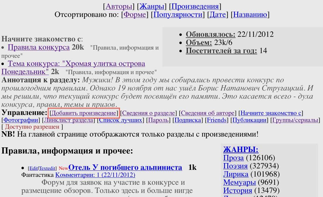 Если в псевдониме автора или названии рассказа обнаружилась ошибка, не та форма или жанр, аннотацию поправить надо, то следует кликнуть на [Edit] - слева от названия - и изменить настройки. После сохранения посмотрите также сам текст рассказа: хорошо ли он выглядит. Текст правится через [Textedit], прямо в самой форме или заливается заново. На всякий случай, запомните, как Вы назвали файл - может случиться, что рассказ потеряется в недрах раздела. Тогда его можно будет найти по ссылке http://samlib.ru/s/stoptannye_k/ИМЯ_ФАЙЛА.shtml.
