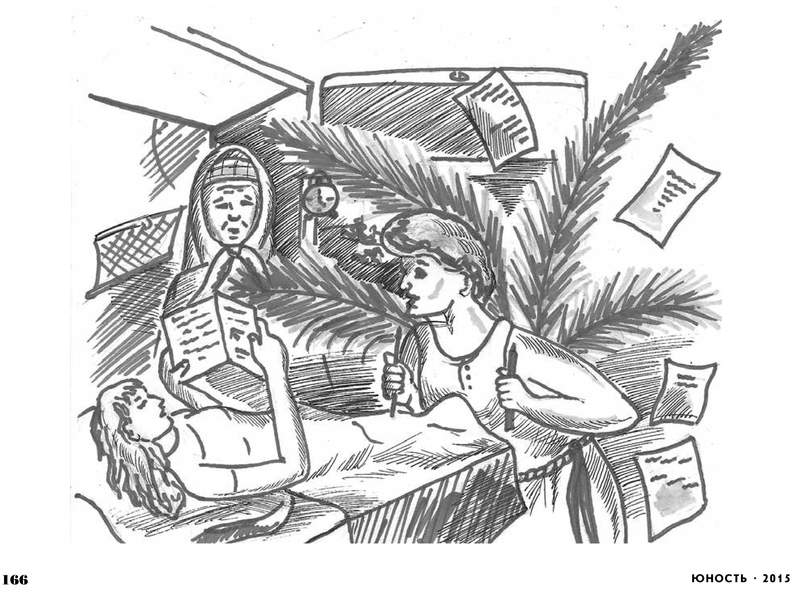 Рисунок Настасьи Поповой, журнал ?Юность? ? 11 (718) 2015; иллюстрация к сценке Ольги Дрей ?Незабываемые попутчицы?. Настасья Попова