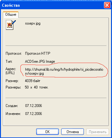 Здесь красным обведён адрес картинки вместе с её именем. Именно всю эту надпись надо вставлять в параметр bacground="сюда вставлять" для целой таблицы или для отдельных её столбцов. Так же, если мы хотим вставить картинку в аннотацию, то в аннотации надо добавить тег картинки, похожий на тот, с помощью которого мы вставляем иллюстрации, но только теперь вместо имени файла с картинкой надо указать полный адрес этой картинки: <img src="полный_адрес_картинки/имя_файла_с_картинкой.расширение"> В Internet Explorer можно просто выделить всю эту строчку и скопировать, нажав CTRL+C или кликнув по выделенному тексту правой кнопкой мыши и выбрав в появившемся меню "копировать" (copy). Потом, в кавычки тега <img src=""> вставить скопированный адрес при помощи CTRL+V (предворительно поместив курсор между кавычек) либо нажав правую кнопку мыши и выбрав "вставить" (paste). Аналогично полный адрес картинок копируется для тех картинок, которые мы помещаем на задний фон. А вообще, можно прописать такие адреса заранее, если внимательно посмотреть, как они устроены. Начинается адрес с http://samlib.ru/img - эта часть адреса будет у всех пользователей одинаковой. Далее идёт буква (латинская) на которую начинается ваше имя - то имя, с которым вы регистрировались!!! Если вы меняли имя потом, эта буква не меняется! Так же как и само имя, которое идёт уже через слеш после буквы! Далее, через слеш идёт то название, которое вы указали для файла, когда загружали его, а уже потом имя файла с картинкой. То есть, получается так: http://samlib.ru/img/ваша буква/имя с которым вы регистрировались/имя которое вы дал _файлу/имя файла с картинкой.расширение Чтобы не ошибиться, лучше всё это хотя бы один раз посмотреть и скопировать. Ведь там всё записывается латиницей. Эта часть: http://samlib.ru/img/ваша буква/имя с которым вы регистрировались/ для Вашего раздела будет неизменной. Дальше просто аккуратно приписывается имя, которое вы дадите файлу, когда загрузите его на сервер и дальше через слеш точное название файла с картинкой. Имейте в виду, что при просмотре файлов через интернет, всё очень чувствительно к регистру букв. Ссылки на картинки должны указываться буквами того же регистра, что и название файлов. СИ автоматически делает все буквы в названиях файлов строчными (маленькими), так что когда вставляете ссылки на картинки, загруженные на СИ, пишите всё строчными буквами! Таким образом одни и те же иллюстрации можно загрузить для одного произведения, а потом, если адрес картинки указывать вот этим способом, вставлять эти картинки и в другие тексты, и в аннотации к группам и самим текстам. Чтобы картинка в аннотации смотрелась лучше, желательно создать в аннотации таблицу из двух столбцов, в один поместить картинку, а в другой - текст, вот так: <table border="0"> <tr> <td> <img src="/img/ваша буква/имя с которым вы регистрировались/имя которое вы дал _файлу/имя файла с картинкой.расширение"> </td> <td> текст аннотации, здесь можно использовать теги абзацев, заголовков (очень не желательно, поскольку создаёт загромождения) и теги ссылок <a href="адрес ссылки">текст ссылки</a> </td> </tr> </table> Примерно так. В аннотацию лучше вставлять маленькие картинки - маленькие по объёму, потому что если в вашей странице на СИ будет много больших картинок, то при открытии такой страницы у пользователя нагрузится сразу много килобайт, и он Вам за это спасибо не скажет. Те, у кого интерне