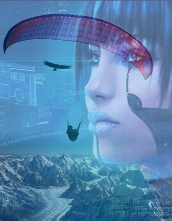 Голубые как небо глаза. Банально, но это так. Как небо. Чёрными парапланами вычерчены брови. Синие, спиралями термических потоков, льются волосы... и безграничный восторг в голосе: